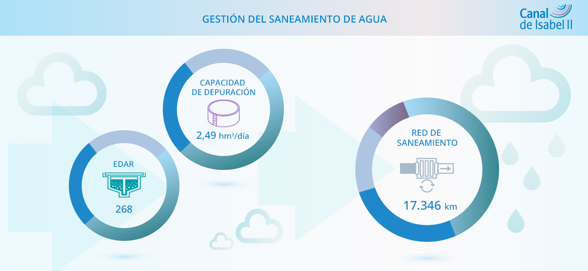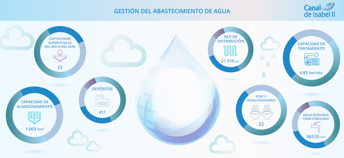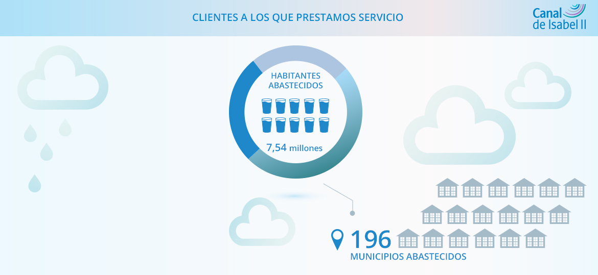 The Canal de Isabel II Group offers services to 9.73 million inhabitants (6.63 in Spain and 3.10 in Latin America) and provides employment to more than 6200 people, generating over 9400 indirect jobs. The experience of Canal de Isabel II, gained over more than a century and a half, allows the company to offer added value to activities in the water sector and in geographical areas outside the Community of Madrid.