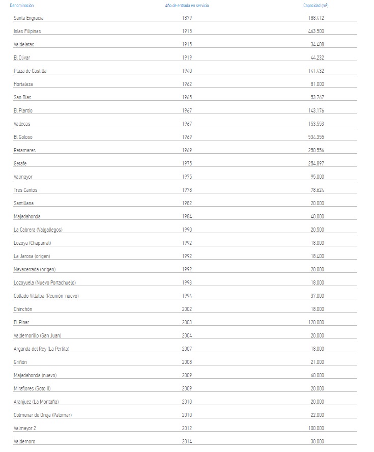 Los 13 embalses gestionados por Canal tienen una capacidad total de almacenamiento de 943,51 millones de metros cúbicos, de los que el 64,26 % se localiza en la cuenca del río Lozoya. El principal embalse de esta región es El Atazar, con una capacidad superior a 425 millones de metros cúbicos.