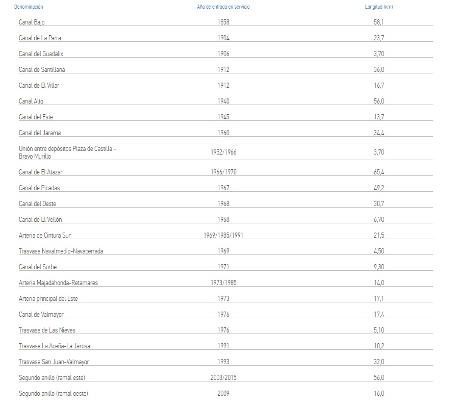 Las grandes conducciones son el elemento fundamental para garantizar la óptima distribución de agua. Enlazadas a modo de anillo, conectan los grandes canales que proceden de los ríos Lozoya y Jarama con los que llegan a los ríos Guadarrama y Alberche.